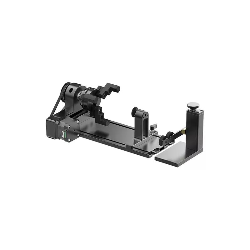A estrutura em alumínio usinado CNC garante excelente rigidez e durabilidade. A instalação é simples: conecta-se diretamente à porta rotativa da D1 Pro e é automaticamente reconhecido pelo software xTool Creative Space. Assim, é possível alternar rapidamente entre gravação plana e rotativa sem necessidade de recalibração.