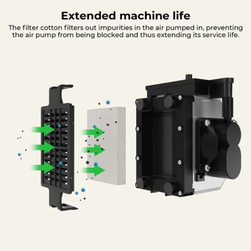 Fácil de instalar e silencioso, também protege a lente do laser para uma maior durabilidade da máquina.
