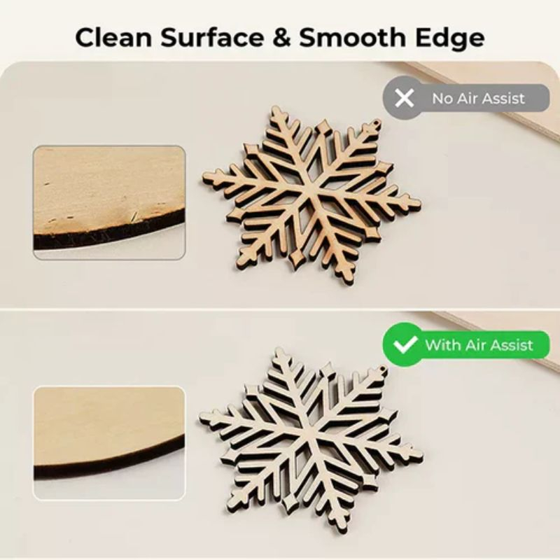 Essa pressão remove resíduos de corte, reduz a fumaça e melhora o desempenho em madeira, couro ou acrílico.