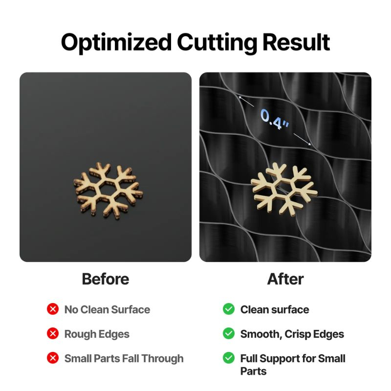 Graças ao design em colmeia, o ar circula livremente sob a peça, limitando a acumulação de calor e reduzindo significativamente as marcas de queimadura ou carbonização na face inferior. Este aspeto é particularmente importante no corte de madeira, contraplacado, couro ou certos plásticos.