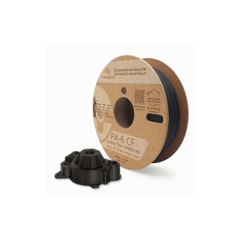 O Nanovia PA-6 CF - 1,75 mm - 500 g é um filamento de nylon reforçado com fibras de carbono desenvolvido para impressão 3D profissional. As suas fibras reduzem o encolhimento, permitem impressão mais rápida e proporcionam resistência mecânica aumentada.