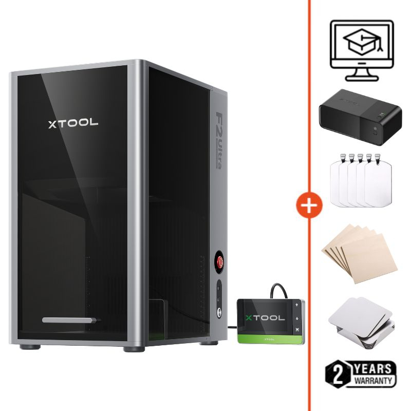 O xTool F2 Ultra Monolaser (MOPA 60W) é um gravador a laser profissional dedicado a metais. Equipado com um laser MOPA de alta potência, permite gravações extremamente precisas e marcações coloridas em aço inox ou titânio.