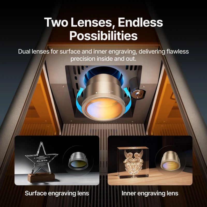 Para gravações internas em vidro ou outros materiais sensíveis, existe uma área de 70 × 70 mm, com lentes intercambiáveis que permitem alternar facilmente entre gravação de superfície e gravação interna.