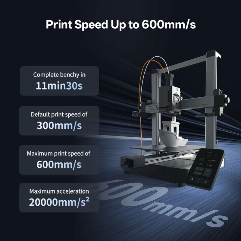 A Kobra 3 V2 oferece velocidades impressionantes (até 600 mm/s), ideais para prototipagem rápida e produção em série de pequenas peças.