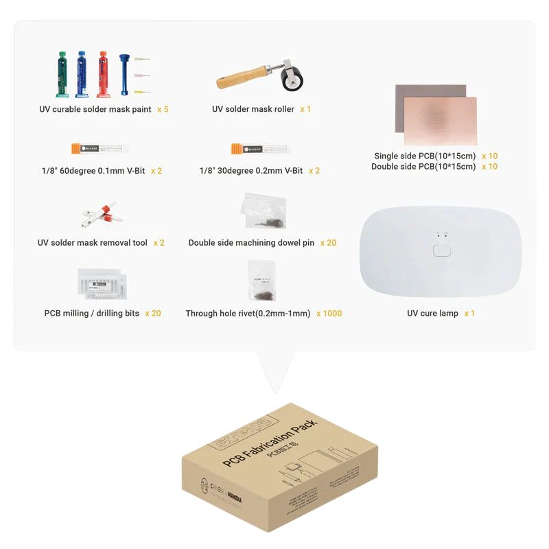O Pack de Fabricação de PCB Makera Carvera é um kit completo que permite produzir PCBs caseiras de qualidade profissional. Compatível com a Makera Carvera desktop CNC, este pack inclui todas as ferramentas e materiais necessários para gravar, aplicar a máscara de solda e realizar serigrafia nas suas PCBs.