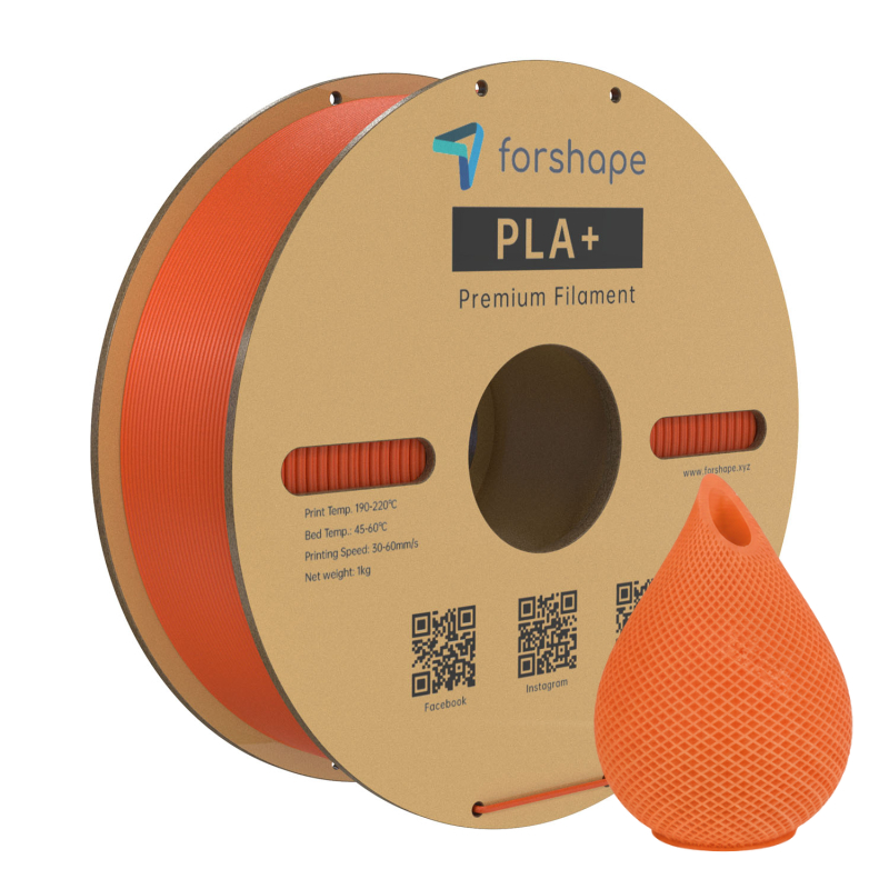 Imprime muito facilmente e adere perfeitamente à mesa da impressora. Ideal para peças decorativas, designs inovadores ou protótipos visuais. A bobina de 1 kg de PLA+ Vermelho-alaranjado Forshape é fornecida com diâmetro de 1,75mm.