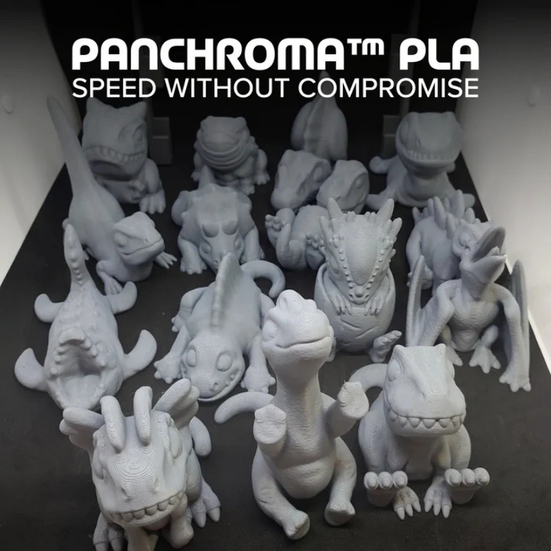 Com uma paleta de 28 cores vivas e uniformes, o Panchroma™ PLA dá vida a todas as suas criações. As superfícies impressas apresentam acabamento acetinado e brilhante.