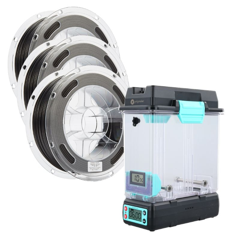 Este pack da Polymaker combina PolyMide PA12-CF Preto e o PolyDryer Polymaker para responder às exigências das impressões 3D técnicas mais avançadas. Desenvolvido com tecnologia “Warp Free”, este filamento de nylon 12 reforçado com fibra de carbono oferece excelentes propriedades mecânicas e térmicas, reduzindo o warping. Em conjunto com o PolyDryer, mantém condições ideais de impressão ao reduzir a humidade, garantindo resultados consistentes e fiáveis.