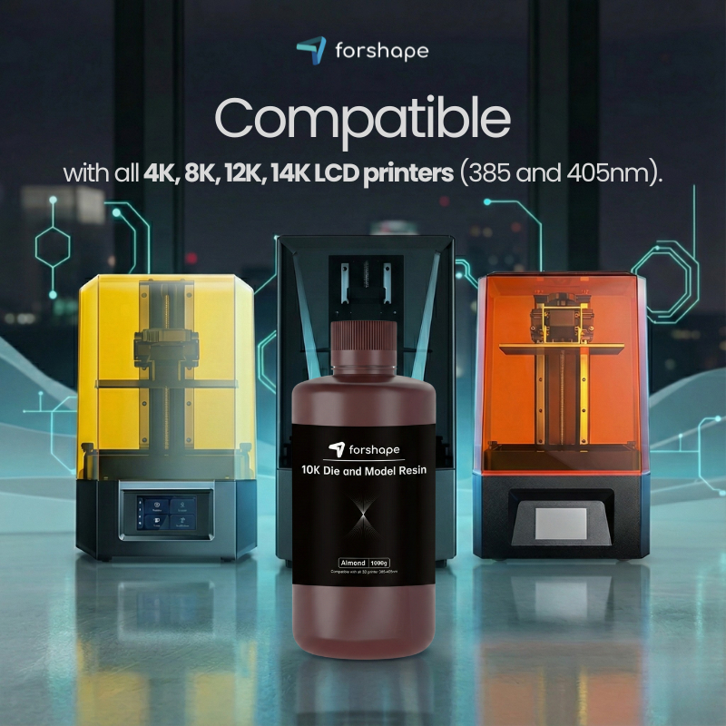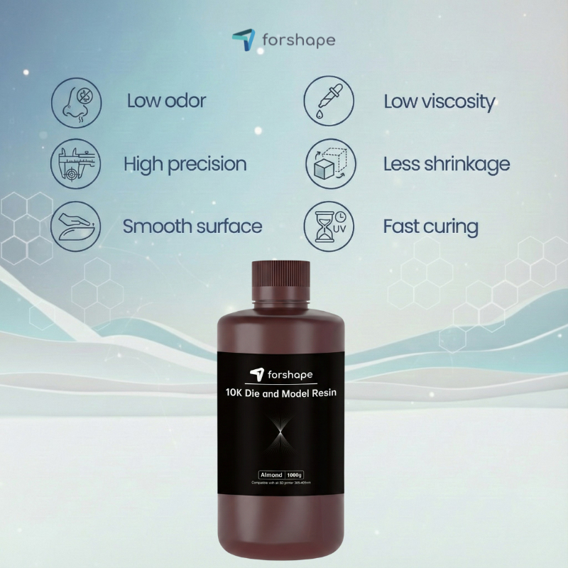 A Resina 10K Die and Model Almond Forshape Premium é uma resina fotopolimérica de altíssima qualidade, especialmente desenvolvida para a criação de modelos dentários de alto contraste. O tom amêndoa facilita a visualização dos detalhes mais finos, enquanto a elevada precisão garante tolerâncias rigorosas para peças removíveis e aplicações dentárias exigentes.