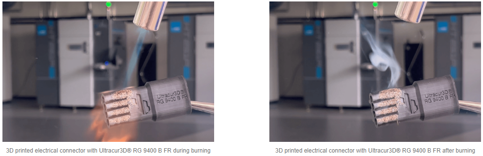 Os materiais retardadores de chama deixam de arder assim que a fonte de chama é removida.Ultracur3D® RG 9400 B FR Esta caraterística torna-o ideal para aplicações electrónicas exigentes, tais como tabuleiros de cabos, conectores eléctricos, caixas de baterias e aplicações eléctricas de alta potência. O material também é adequado para gabaritos e acessórios personalizados, bem como peças de substituição para ambientes industriais com fontes de ignição elevadas e HDT.