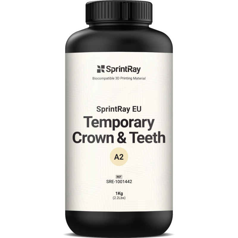 A resina EU Temporary Crown & Teeth A2 da SprintRay é o material ideal para a produção rápida de coroas, pontes temporárias e dentes protéticos estéticos e resistentes.