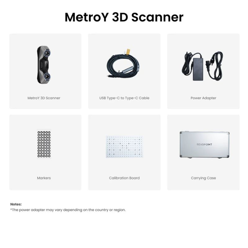 O Revopoint MetroY é um scanner 3D preciso para objetos de pequeno e médio porte. Possui uma precisão volumétrica de 0,02 + 0,04 mm/m e pode capturar até 1,5 milhão de pontos por segundo.