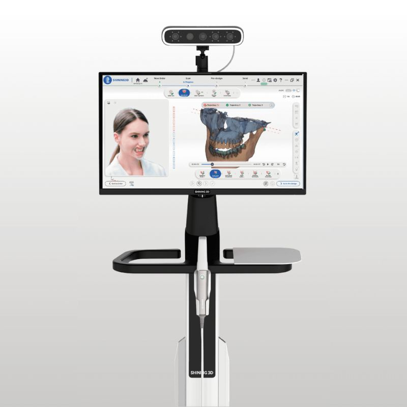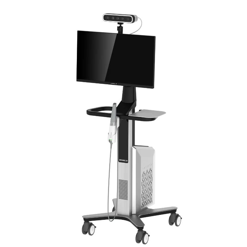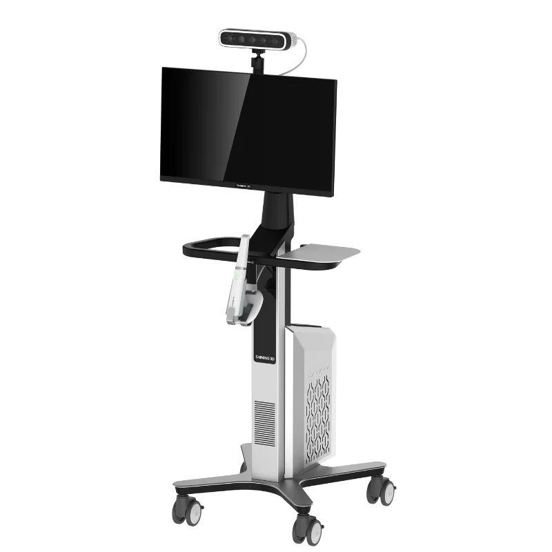 A Shining 3D e-Motion Workstation foi concebida para oferecer um verdadeiro espaço dedicado ao fluxo digital dentário. Mais do que um simples carrinho, é uma estação integrada que reúne suporte para scanner intraoral, suporte para scanner facial, monitor, computador médico e uma superfície de trabalho otimizada. A sua ergonomia facilita a captura de impressões intraorais, melhora a postura do profissional e torna mais fluidos os movimentos clínicos, tanto na cadeira como no laboratório.