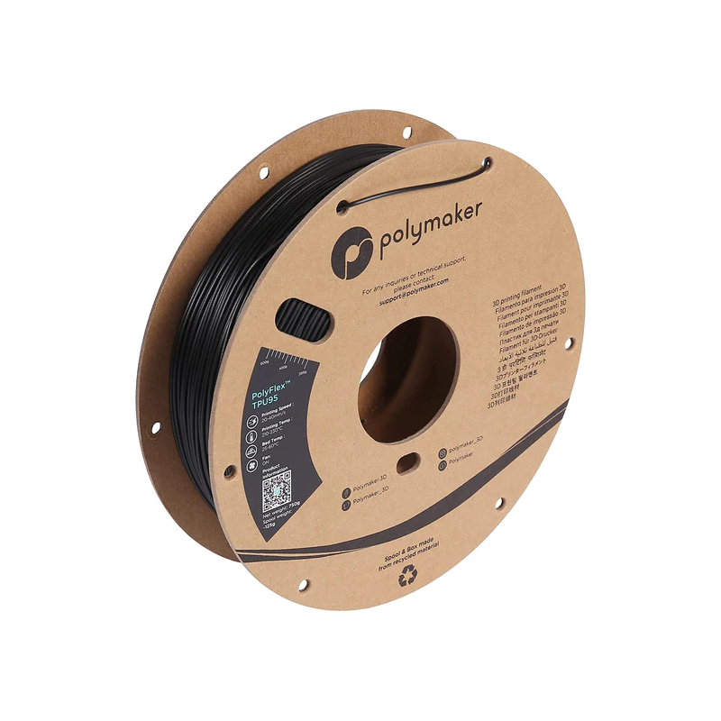 O PolyFlex TPU-90A Preto da Polymaker é um filamento flexível e durável com dureza shore 90A, resistência aos raios UV e boa resistência ao rasgo.