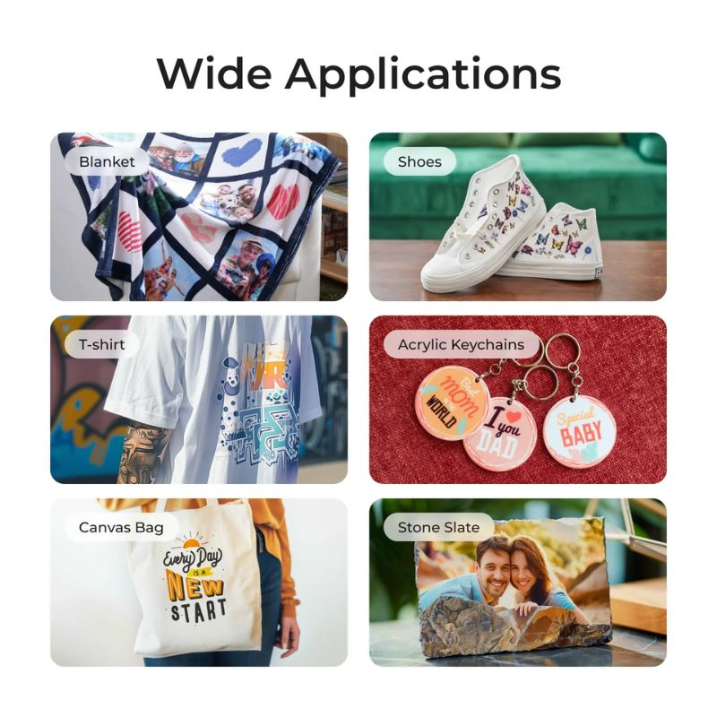 Este kit completo é compatível com uma grande variedade de materiais, como vinil transferível (HTV), sublimação, transferências DTF e muito mais. É perfeito para personalizar roupas, bolsas, acessórios, bonés e outros itens têxteis.